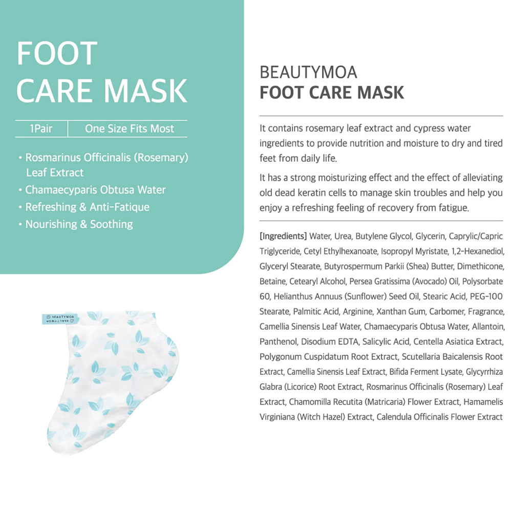 The foot care mask by polyclean is a revolutionary Korean cosmetic product that Contains rosemary leaf extract and cypress water to provide nutrition and moisture to dry and tired feet. and It has a strong moisturizing effect and the effect of alleviating old dead skin cells, so you can manage skin troubles and feel a refreshing feeling of recovery from fatigue.